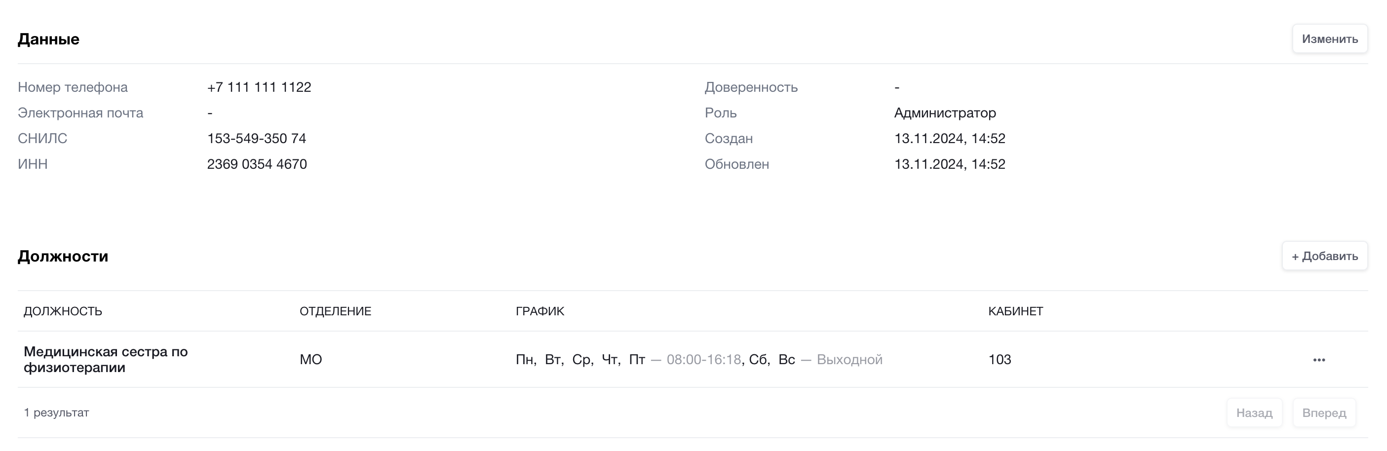 В поле “Кабинет” укажите кабинет в котором работает сотрудник. Если сотрудник не ведет прием по расписанию или в порядке живой очереди указывать кабинет не нужно.