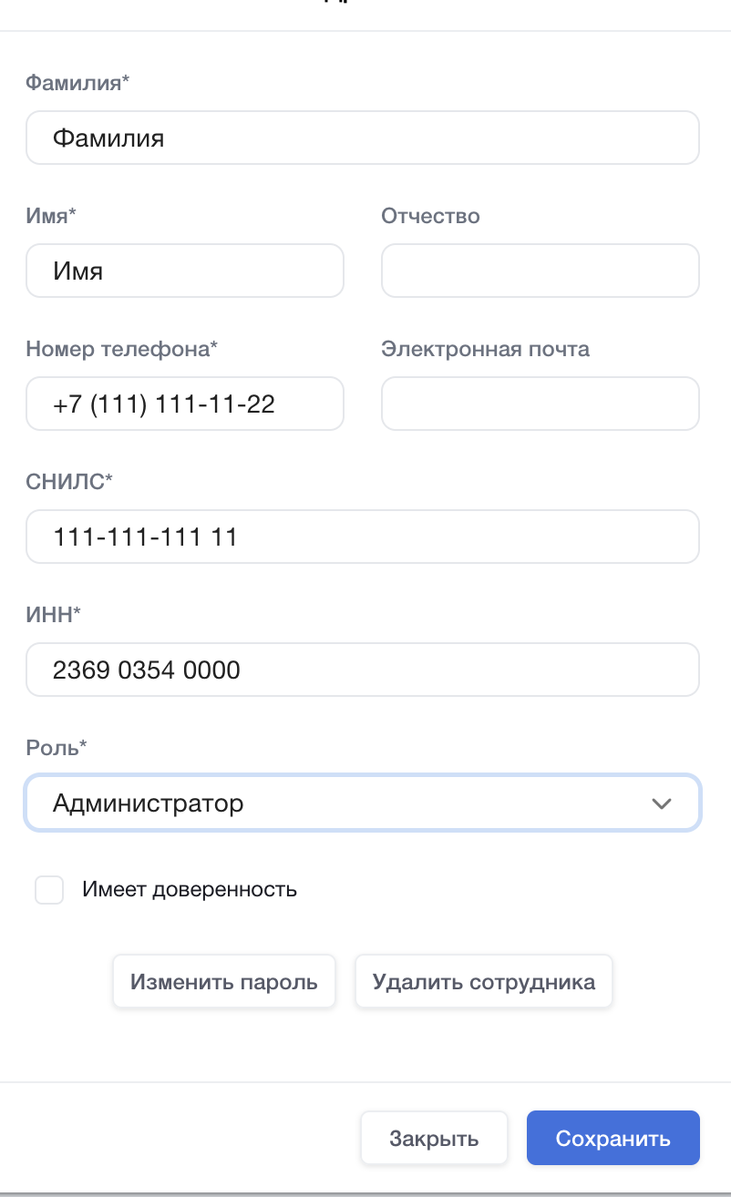 Нажмите на кнопку сохранить. Сообщите новому сотруднику пароль для доступа в МИС и попросите его заменить при первом входе в целях безопасности.