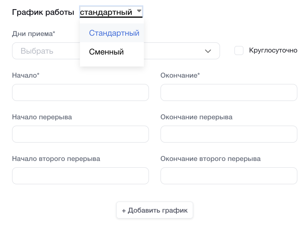 Для заполнения стандартного графика выберите дни приема, заполните время работы и перерыва.