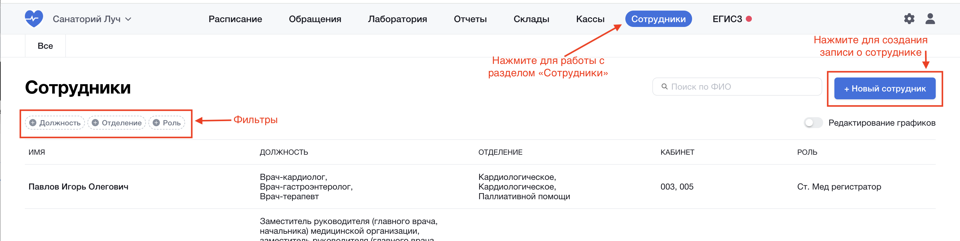 Для внесения сведений о новом сотруднике нажмите кнопку “+ Новый сотрудник”.