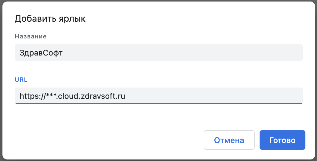 В появившемся окне ввести название и URL(Если у вас нет данных для поля URL напишите на почту info@zdravsoft.ru, либо обратитесь к лицу, ответственному за внедрение(взаимодействие) с командой ЗдравСофт.