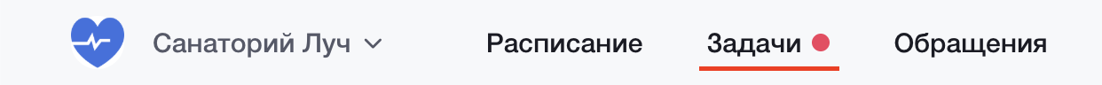 Раздел Задачи находится в навигационной панели в верхней части экрана. Раздел позволяет смотреть приемы и задачи, назначенные на любую дату или диапазон дат. Красная точка у кнопки раздела означает, что на сегодня есть незавершенные задачи. Из раздела можно перейти к любому протоколу. Когда все протоколы оформлены, красная точка исчезает. |