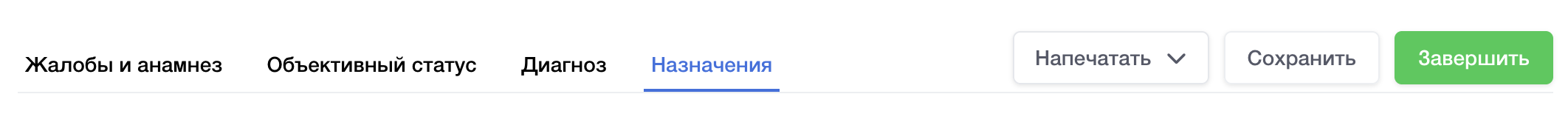 После окончания осмотра не забудьте завершить прием нажатием зеленой кнопки “Завершить” в правом верхнем углу экрана и вводом своего пароля.