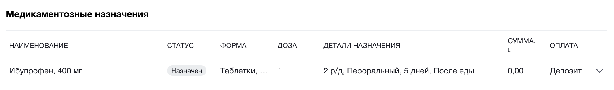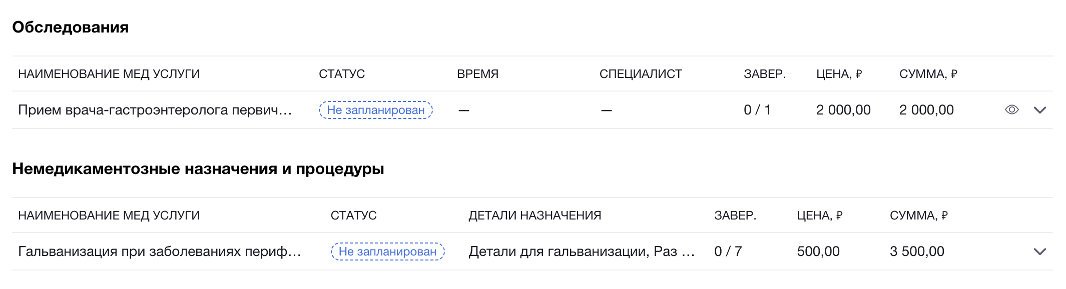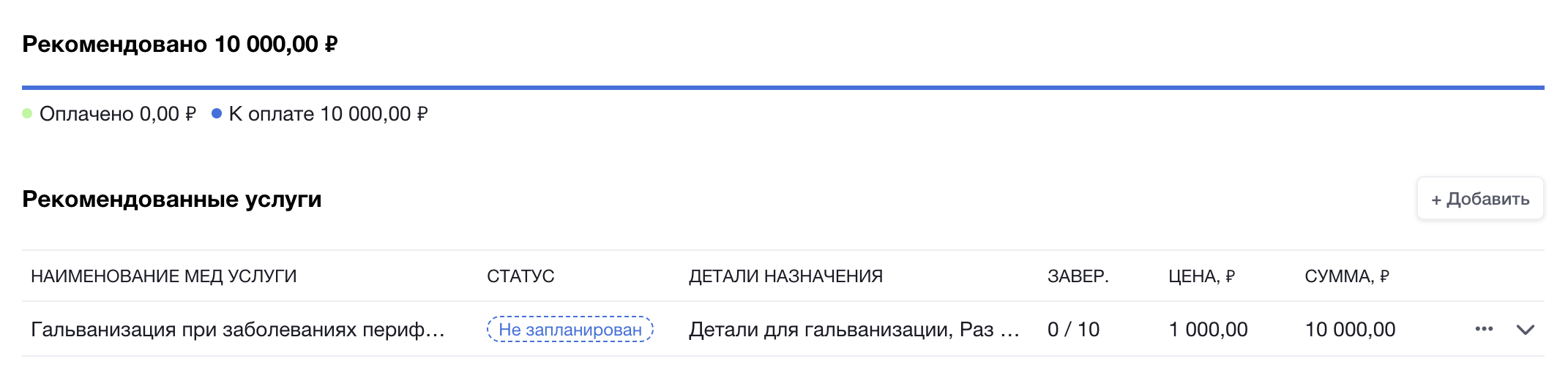 Таблица “Рекомендовано” позволяет добавить дополнительные назначения, которые пациент будет оплачивать самостоятельно в дополнение к основному лечению.